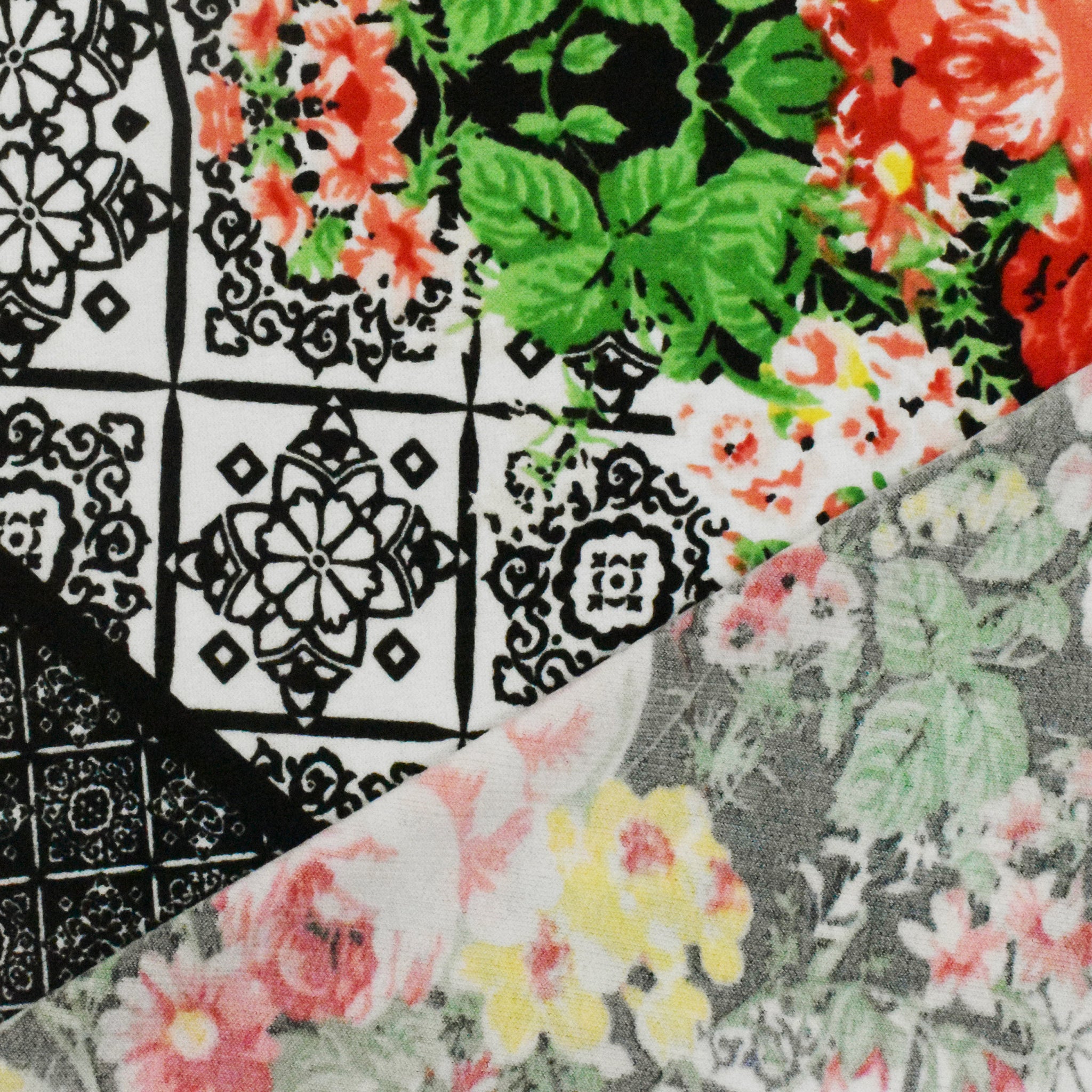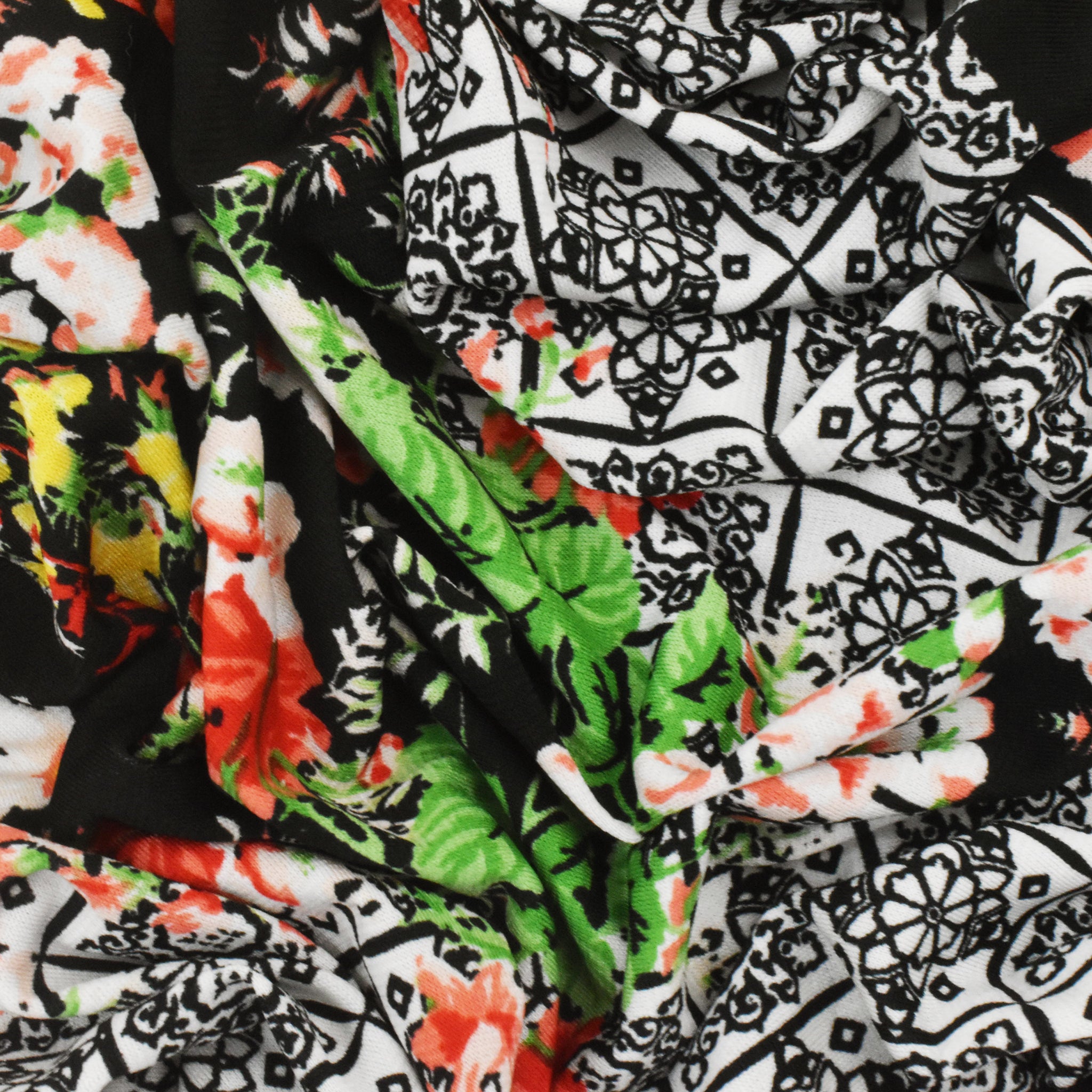 -Multicolored large-scale border and floral pattern printed ITY knit fabric