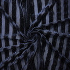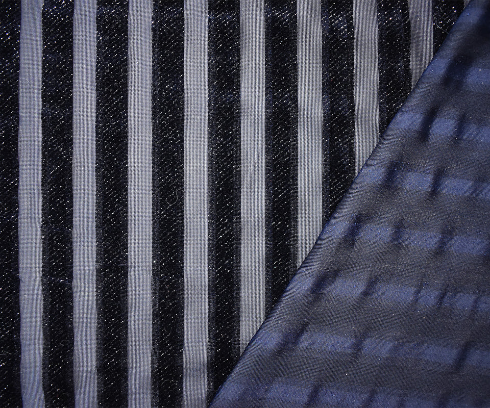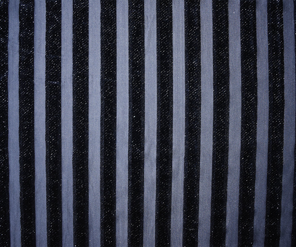 -Striped burnout velvet knit fabric with subtle silver sparkles, featuring an opaque and sheer surface.