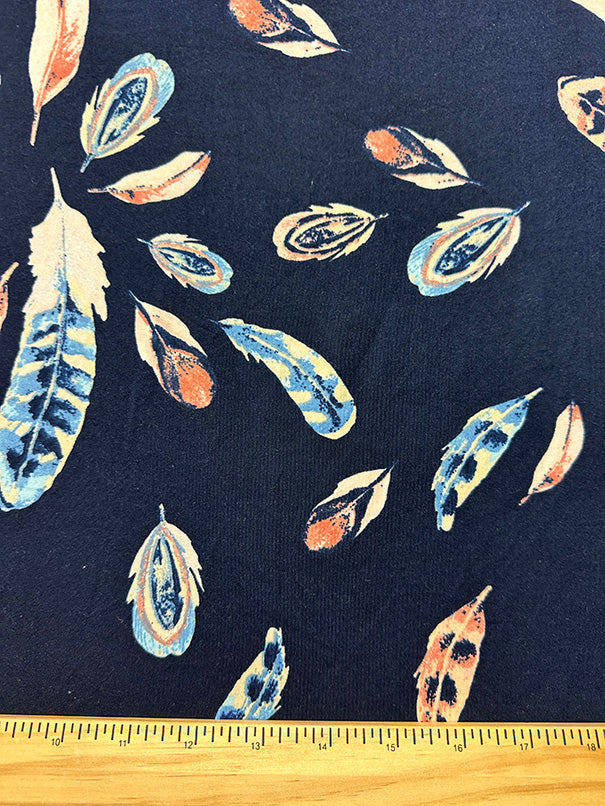 -Blue, Peach, Pink, & White Feather Print on Navy Blue Double Brushed Jersey Knit Fabric