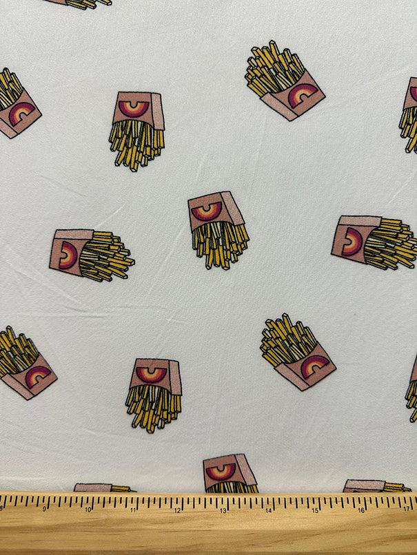 -Pink, Red, Yellow, & Black Rainbow Fries Print on Ivory Double Brushed Jersey Knit Fabric