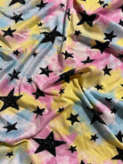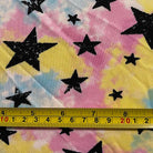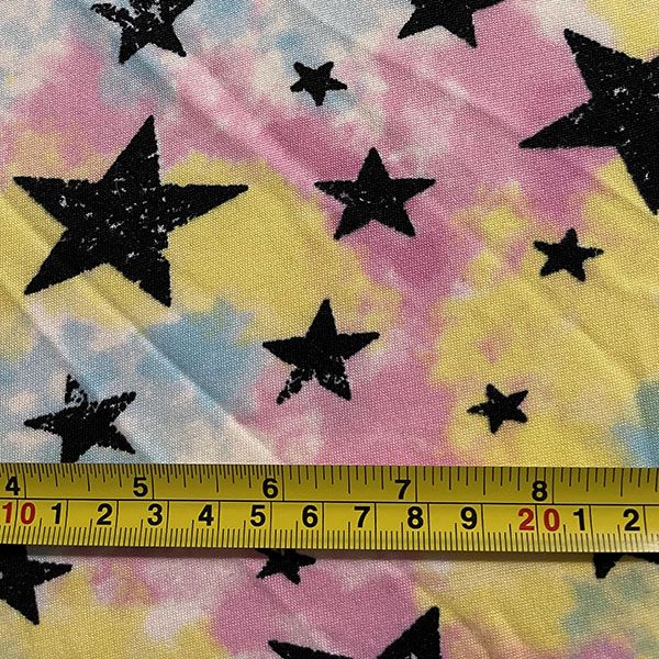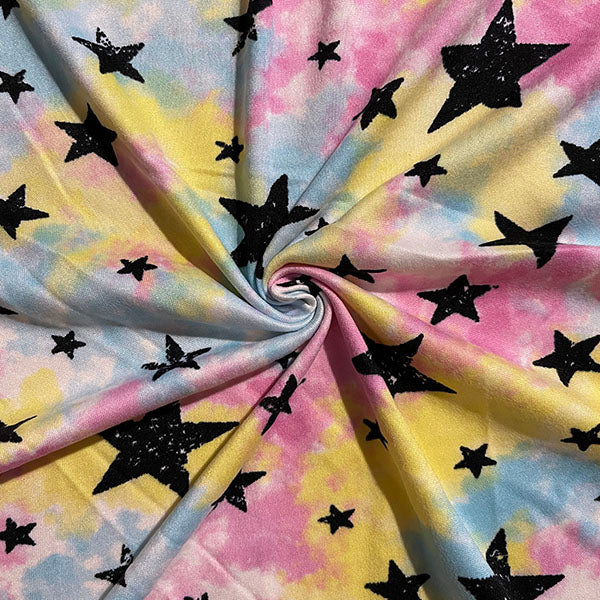 -Black Stars on Pink, Yellow, & Blue Tie Dye Look Print on White Stretch Double