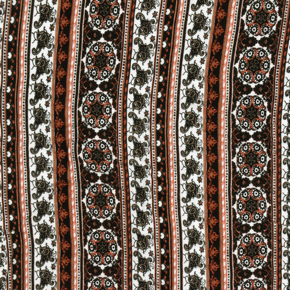 -Low luster morrocan inspired pattern in a striped arrangement printed on a stretch jersey knit fabric