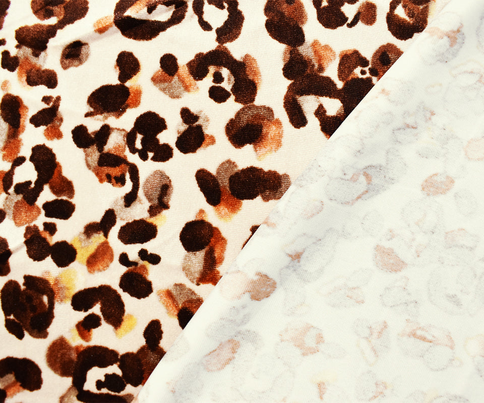 -Plush velvet knit fabric with an abstract leopard inspired pattern. The poly-spandex blend provides excellent stretch and recovery for form-fitting designs. Its soft, dense pile offers a luxurious hand feel and rich texture, ideal for statement garments.