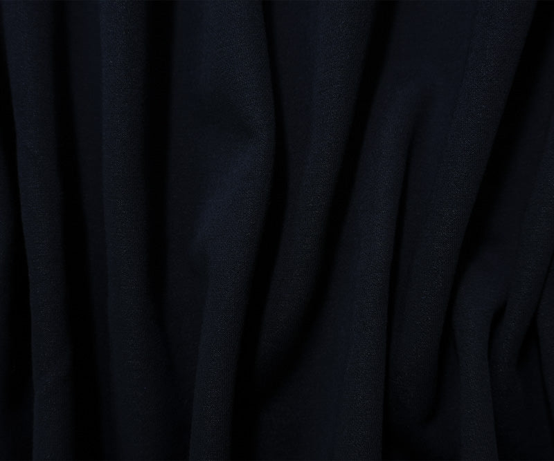 -Cotton blend double knit fabric featuring a solid navy blue on one side and a black solid blue on the reverse.