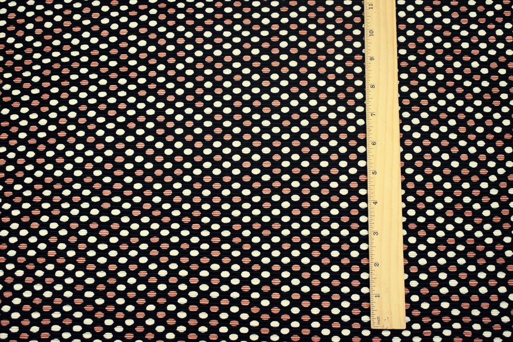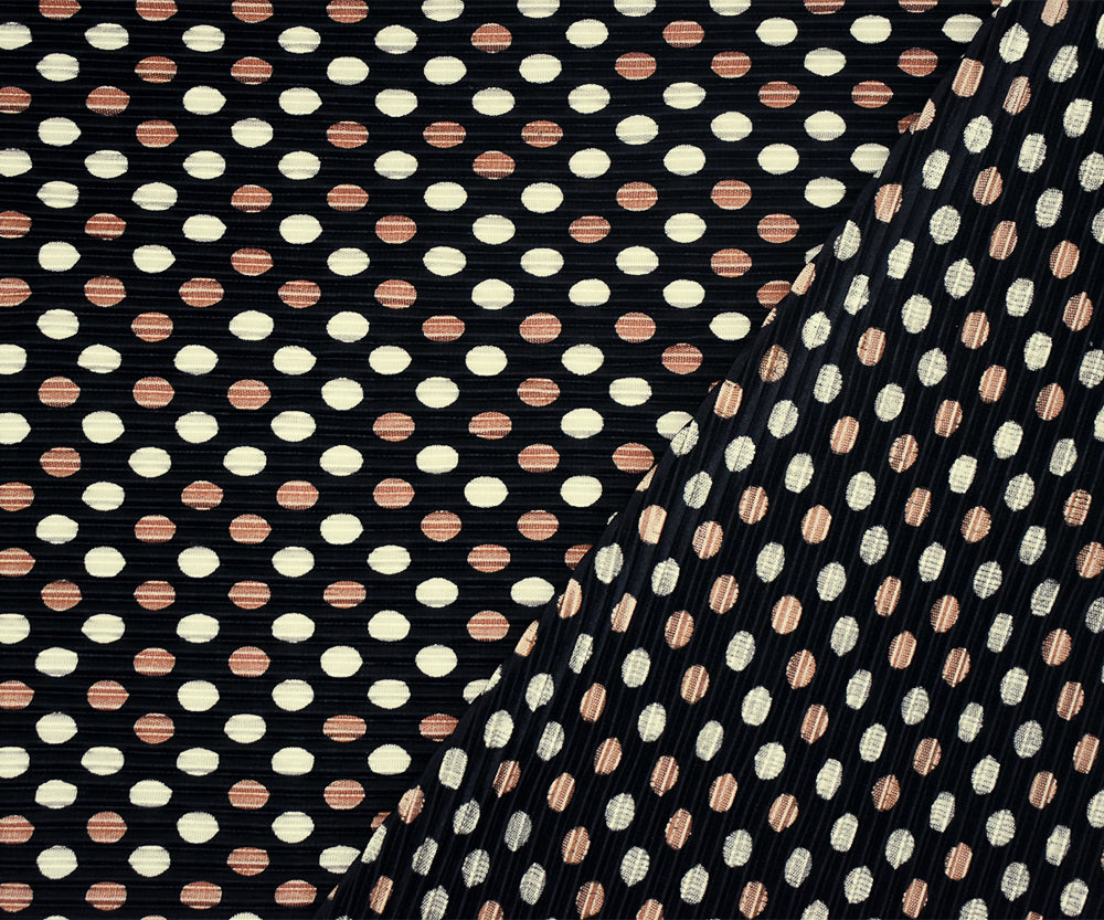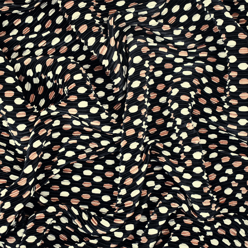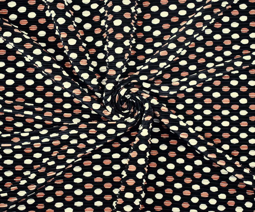 Black-Copper-White Dot Printed Stretch Pressed Pleated Satin Knit Fabric