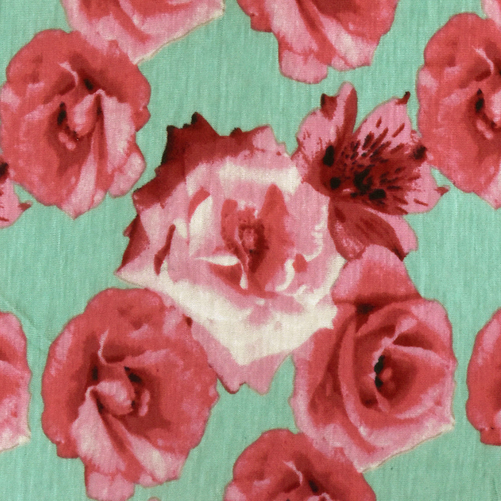 Mint Green-Pink-Multi Rose Printed Slub Rayon Stretch Jersey Knit Fabric