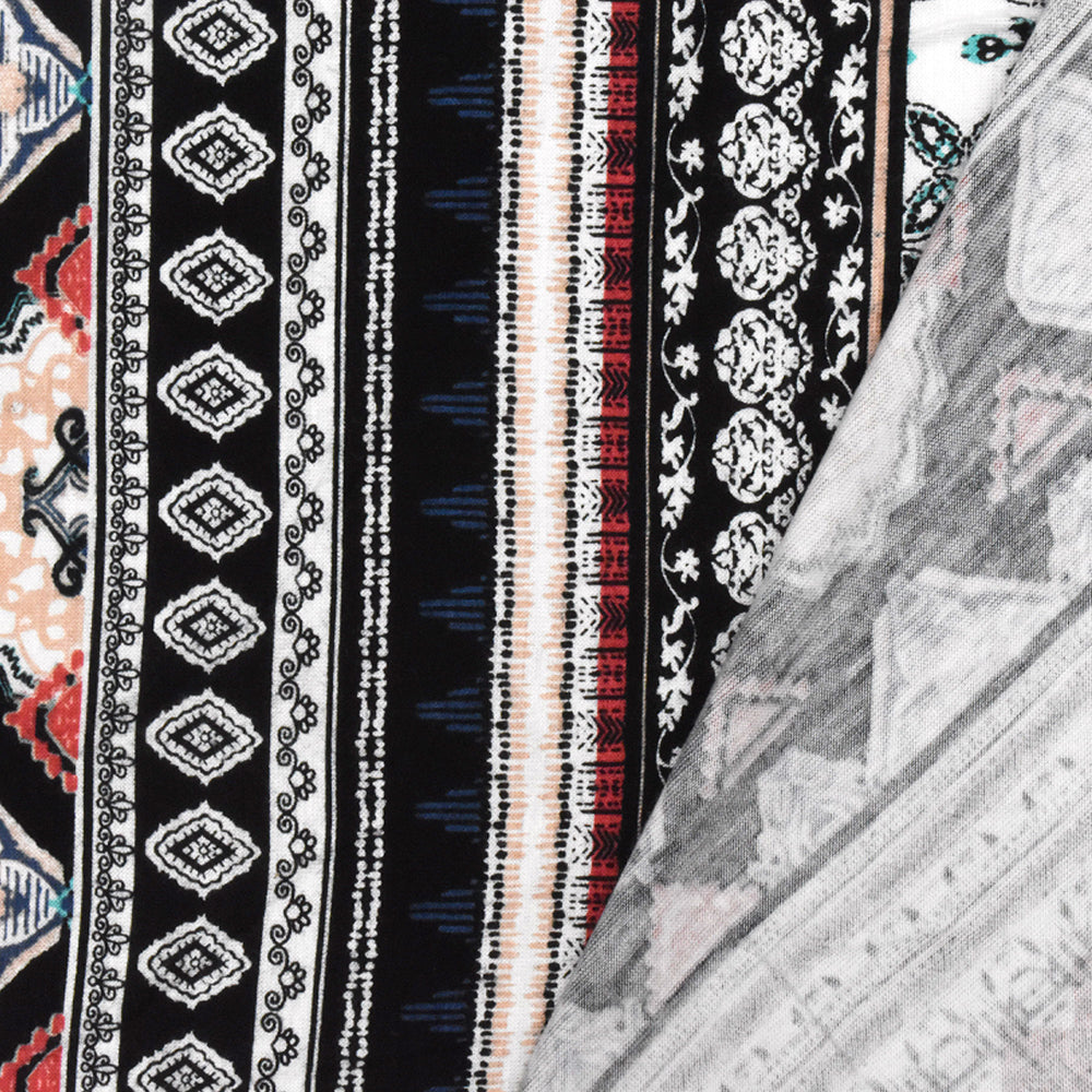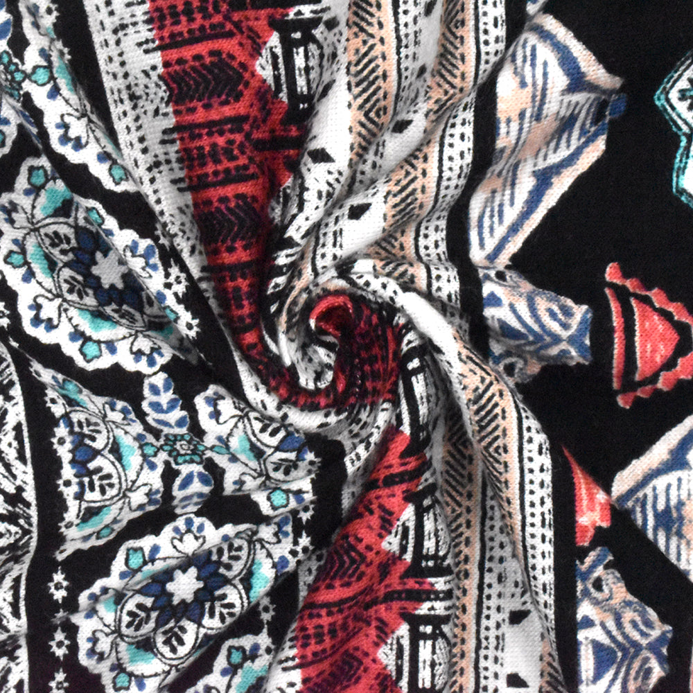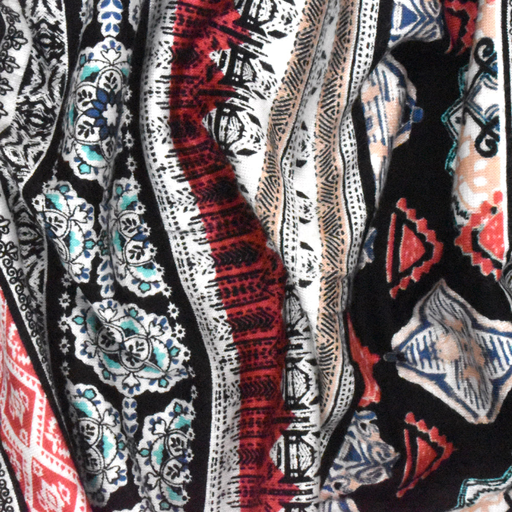 Red-Multi Striped Mixed Pattern Print Slub Rayon Stretch Jersey Knit Fabric