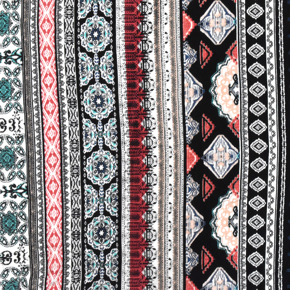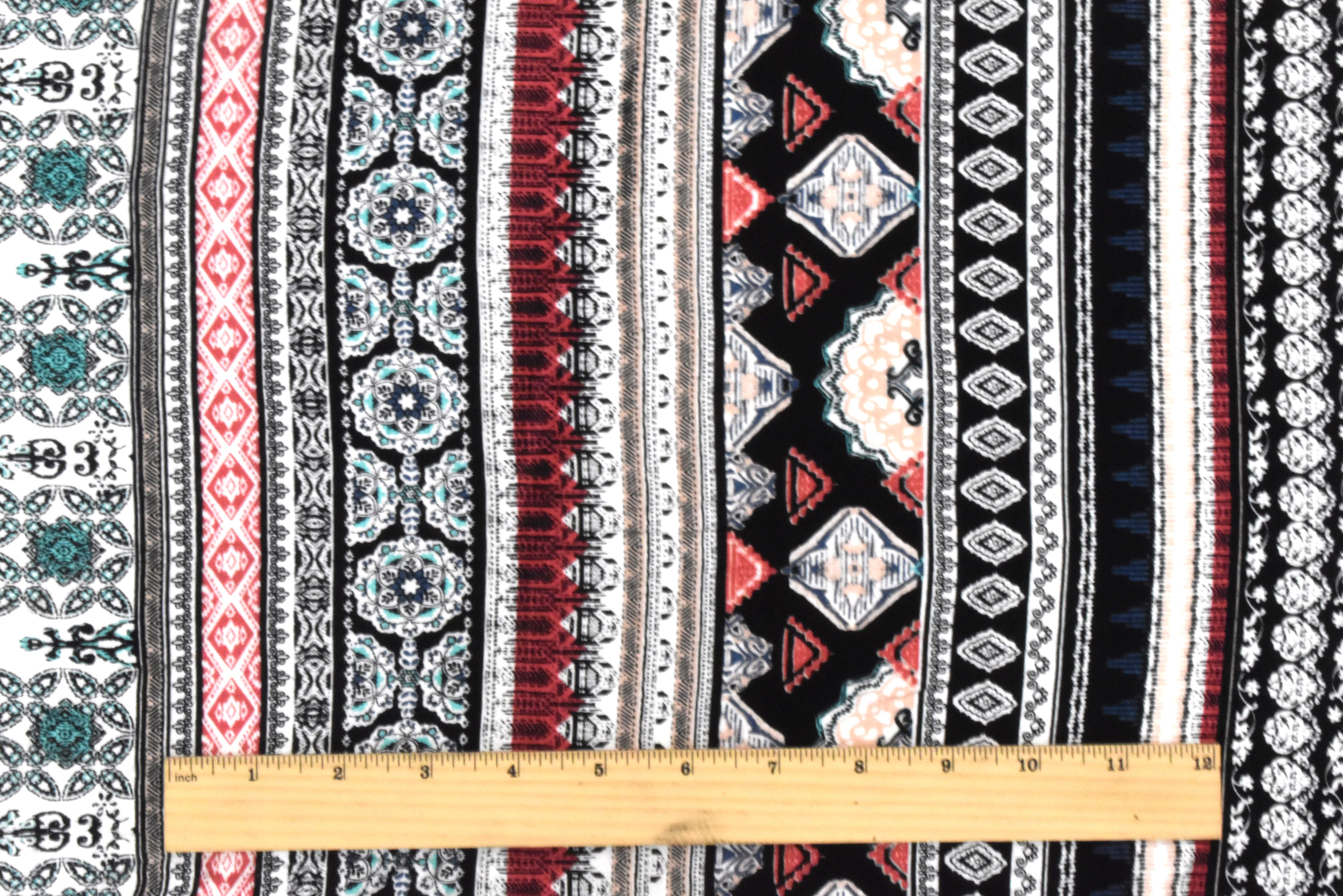 -Rayon slub jersey knit fabric printed with Moroccan inspired elements in a stripe arrangement