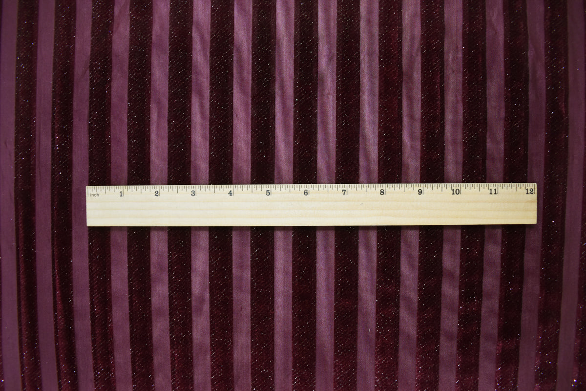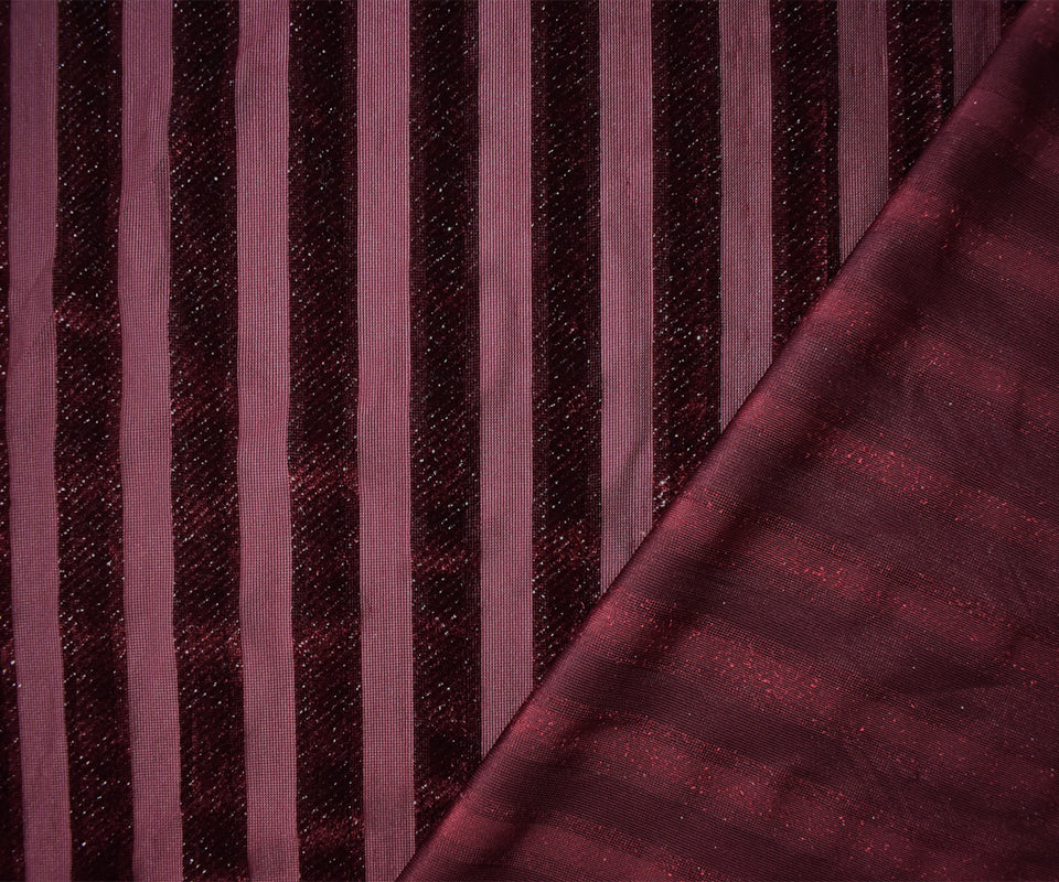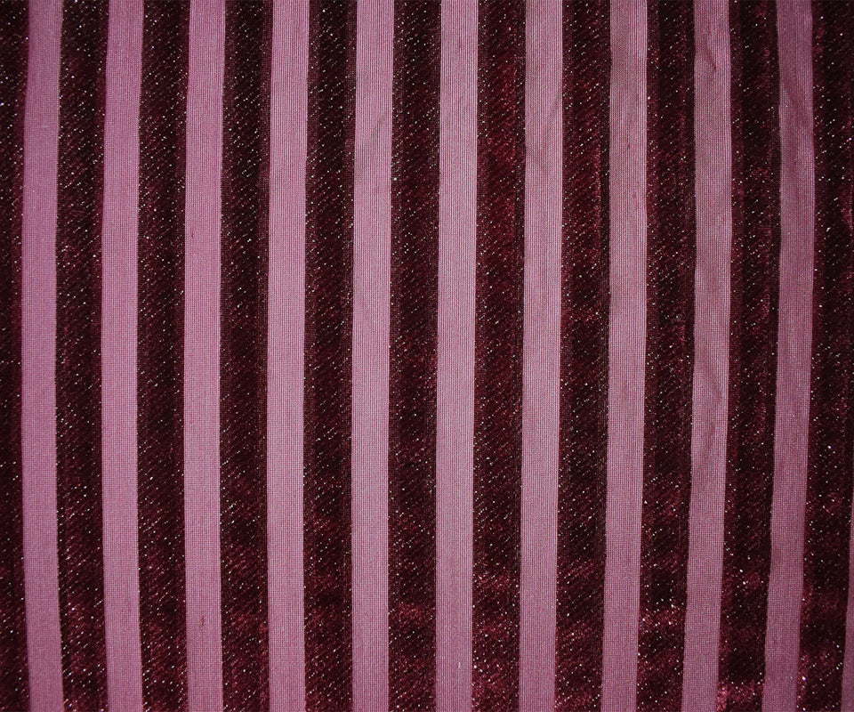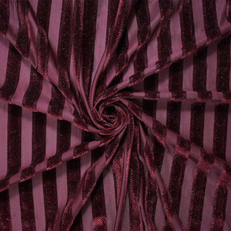-Striped burnout velvet knit fabric with subtle silver sparkles, featuring an opaque and sheer surface.