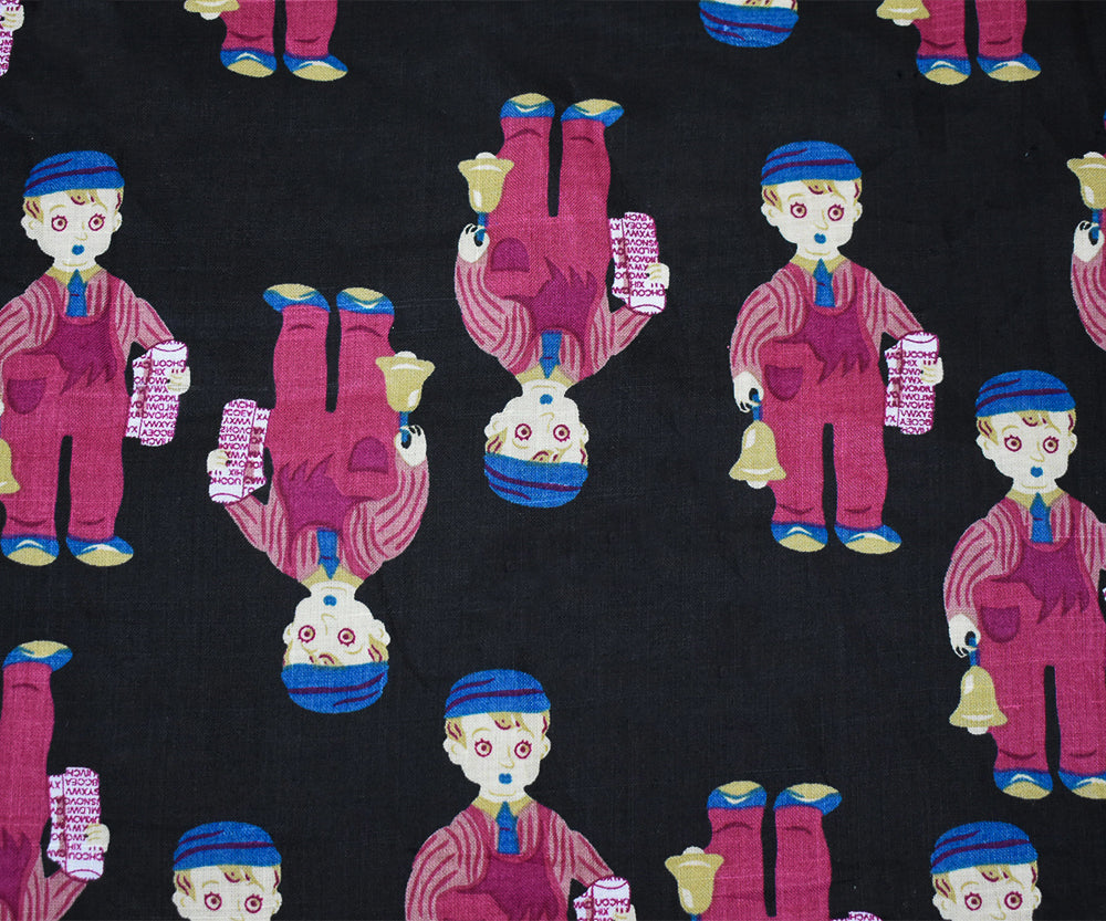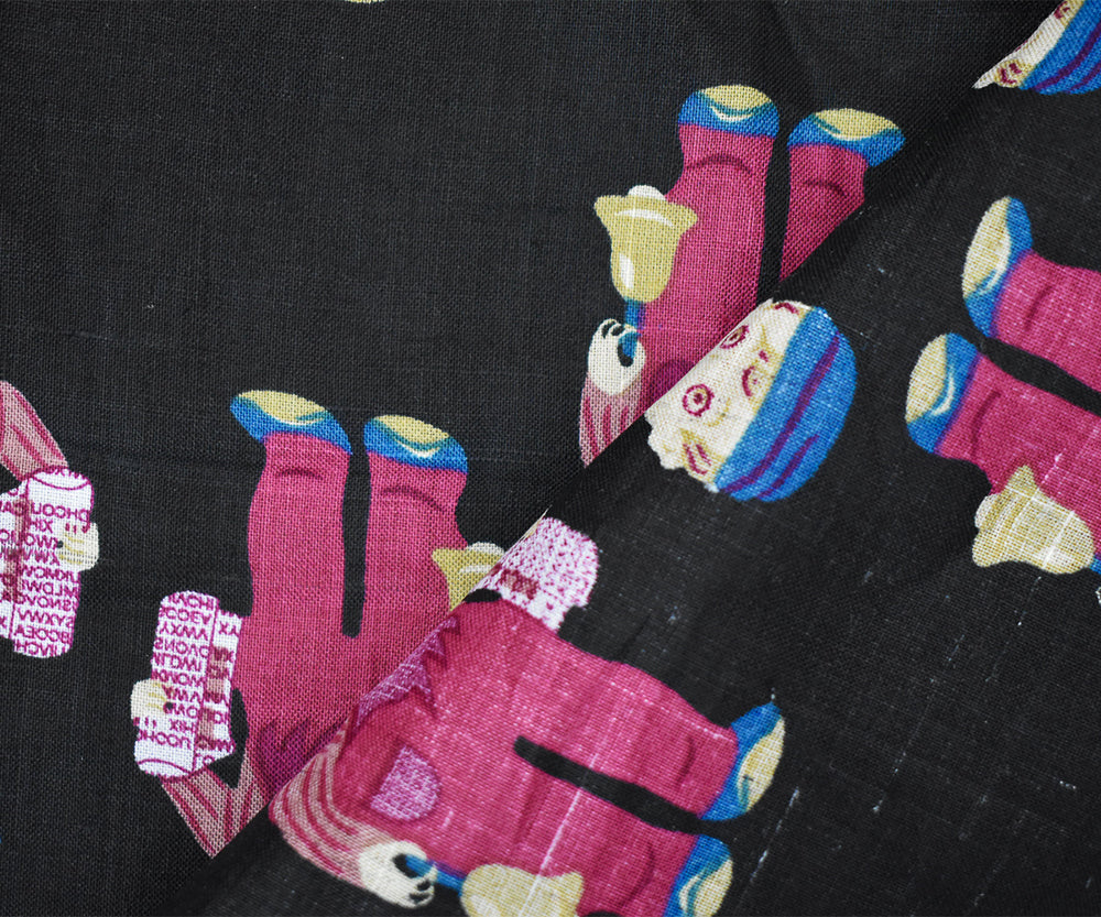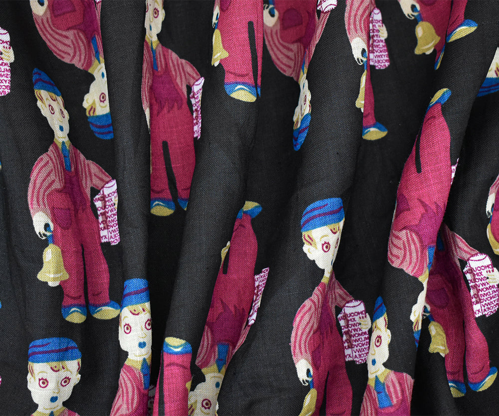 -100% linen plain woven fabric printed with a little boy doll figure motif holding a bell and a newspaper. Line if needed.