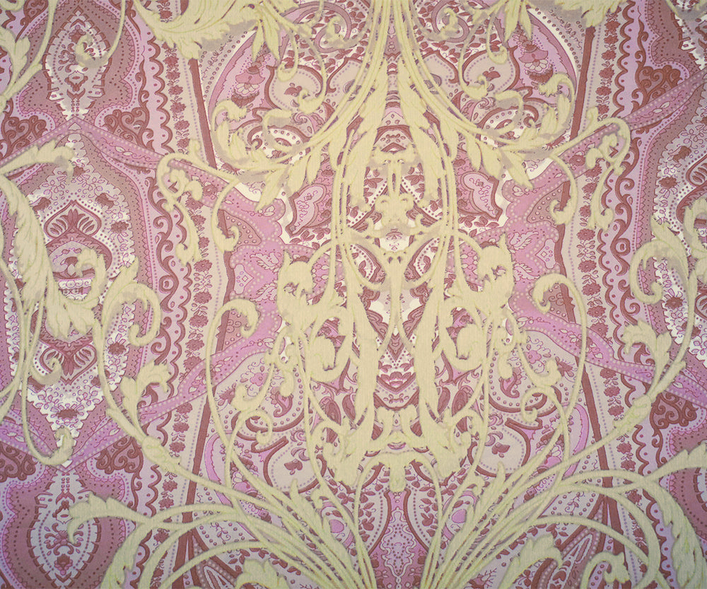 -100% cotton sateen woven fabric printed with a baroque pattern with a fancy paisley pattern in the background.