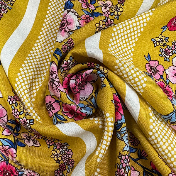 2 YD PC-Gold Floral Stripe Print Rayon Challis Fabric