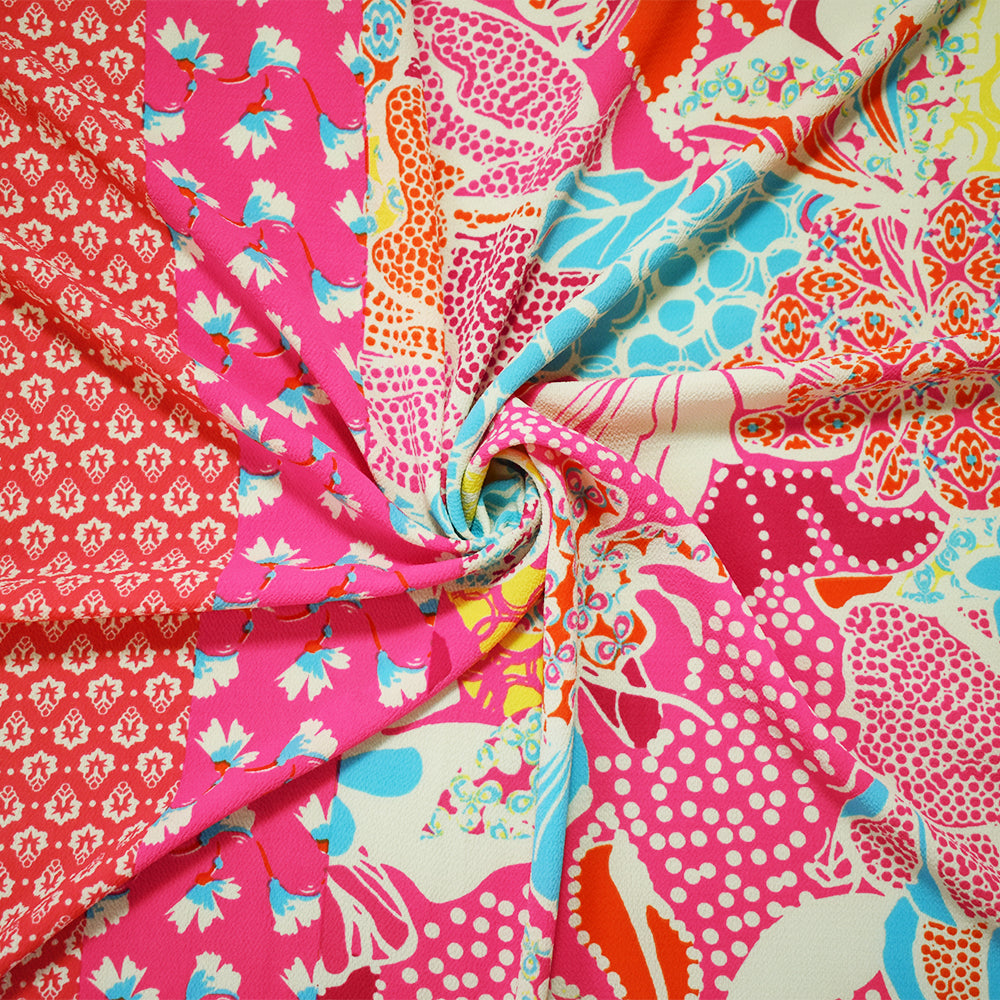 Pink-Multi Poly Stretch Spandex Floral Printed Pebble Crepe Woven Fabric