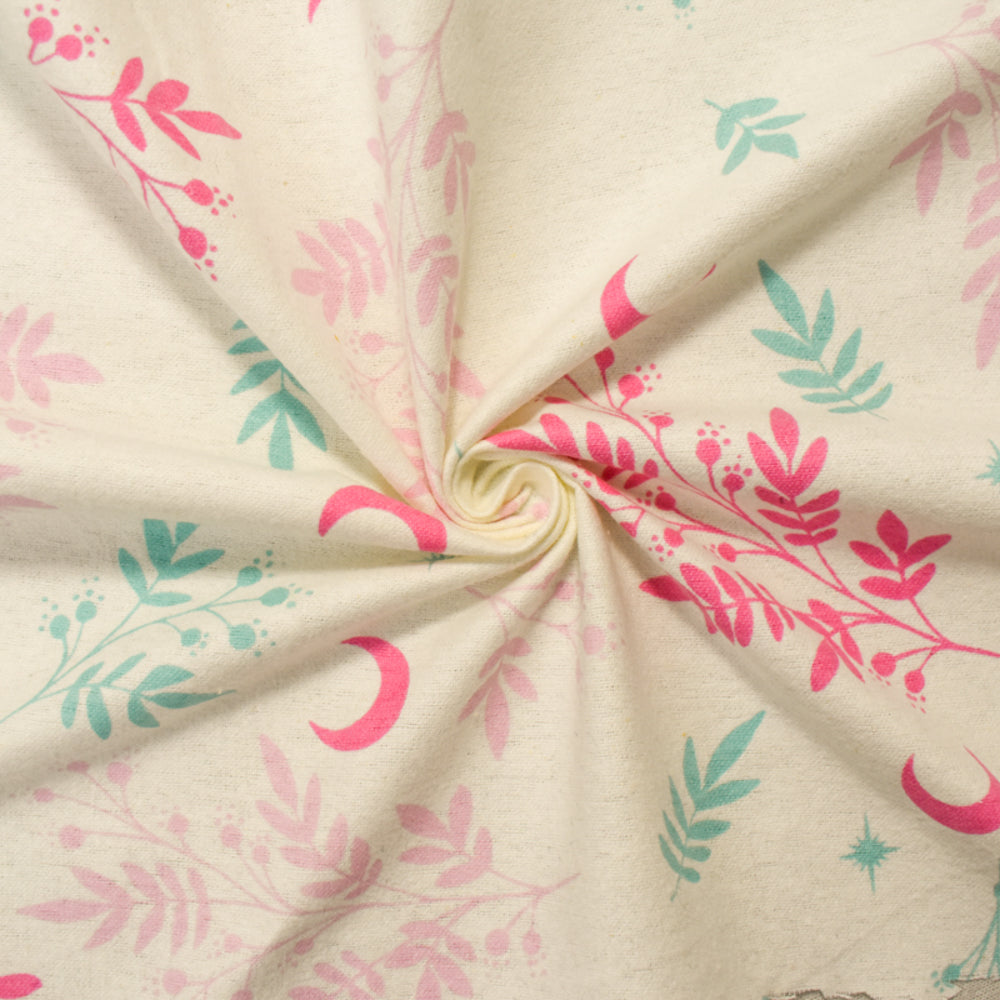 Pink-Teal-Multi Cotton Moon Leaves Printed Flannel Woven Fabric