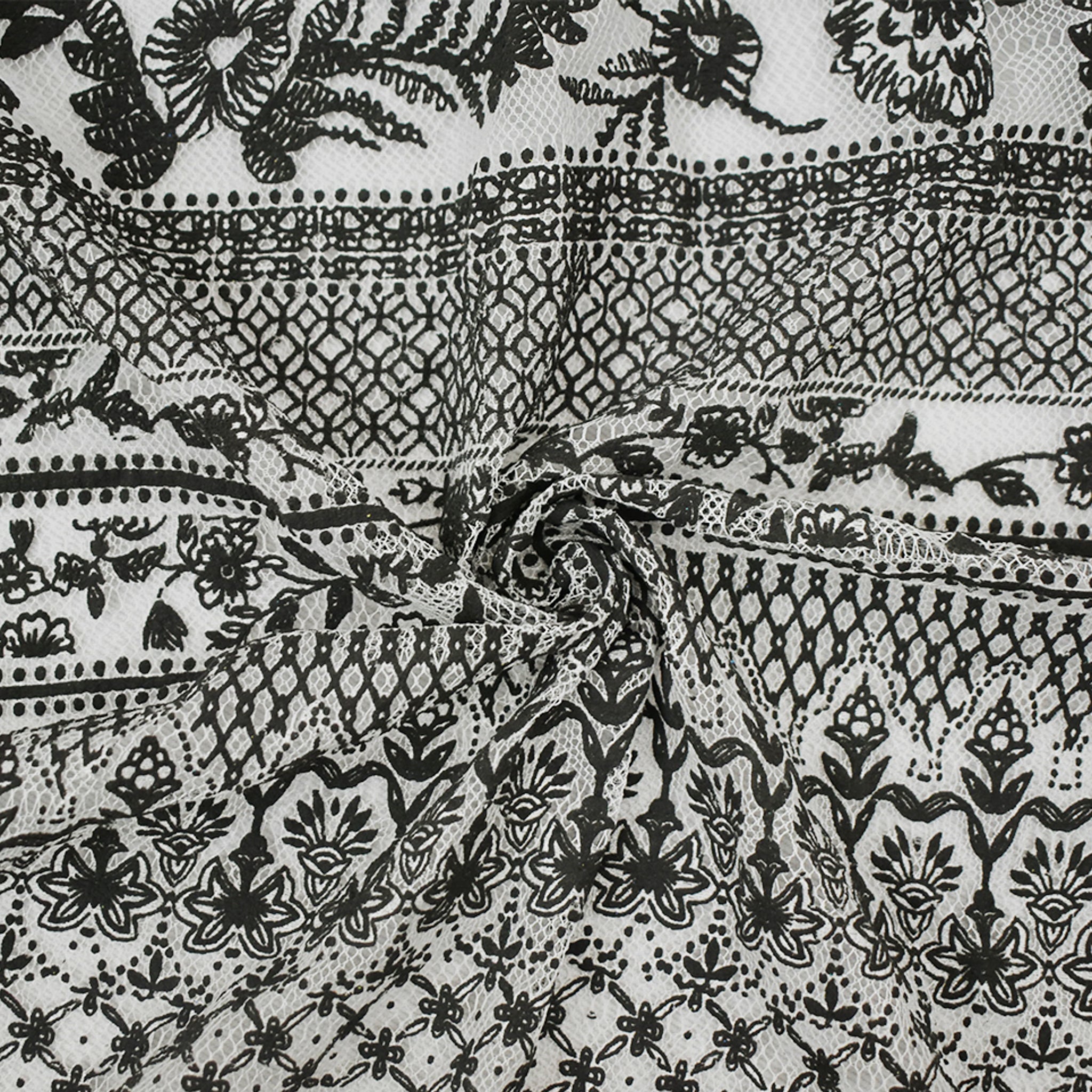 Black-White Cotton-Poly Floral Patch Printed Lace Mesh Knit Fabric