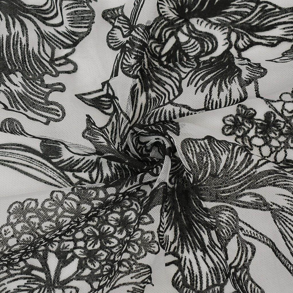 Black-White Nylon Floral Printed Mesh Tulle Knit Fabric