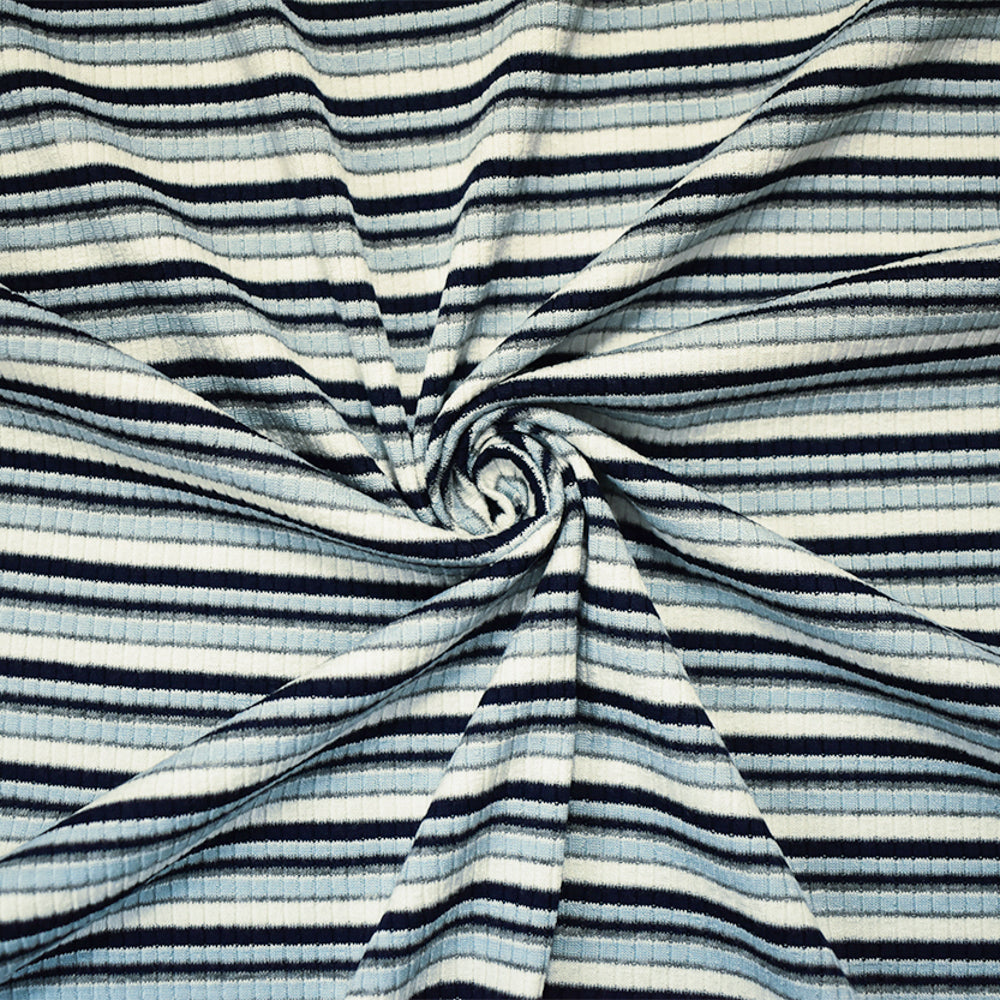 Blue-White-Gray Cotton Stretch Spandex Horizontal Stripe Rib Knit Fabric