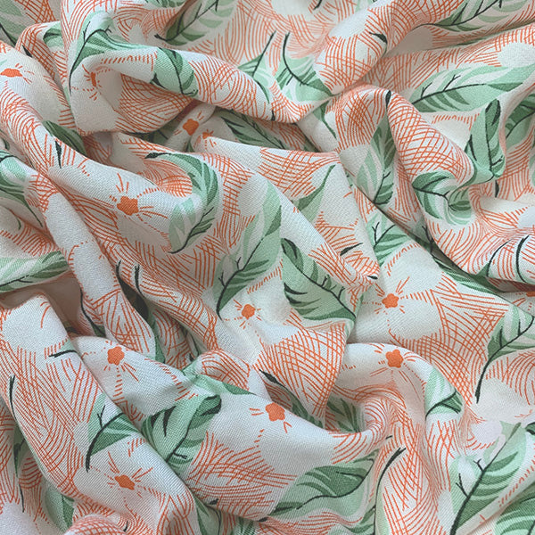 1 YD PC-White and Neon Orange Floral Print Rayon Challis Fabric