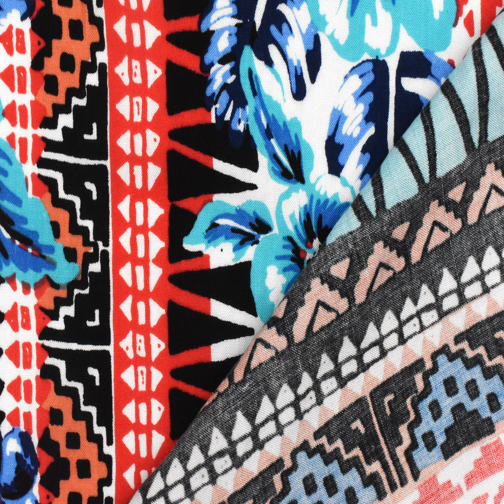 -Floral and Aztec elements in a stripe arrangement printed on a rayon challis fabric
