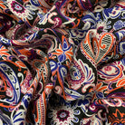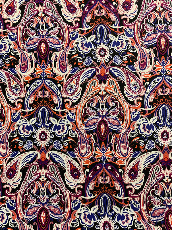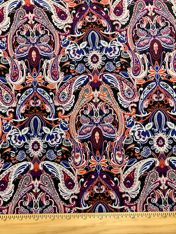 -Black, Magenta, Orange, Purple, White, & Pink Floral Scroll Print Rayon Challis Fabric