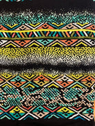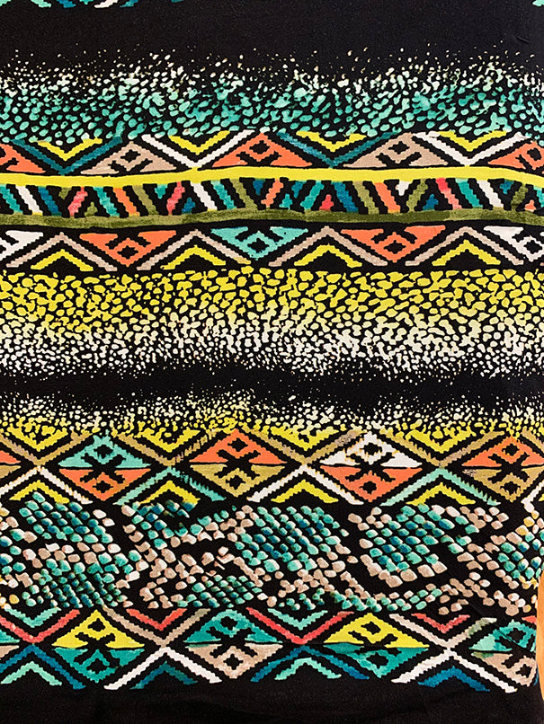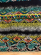 -Black, White, Yellow, Aqua, Coral, Yellow, & Tan Multi Splatter Stripe Print Rayon Challis Fabric