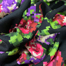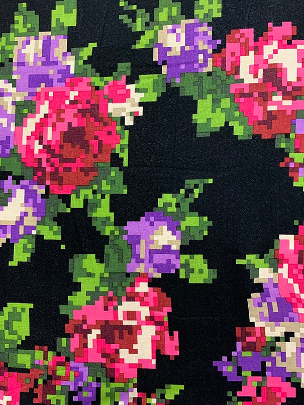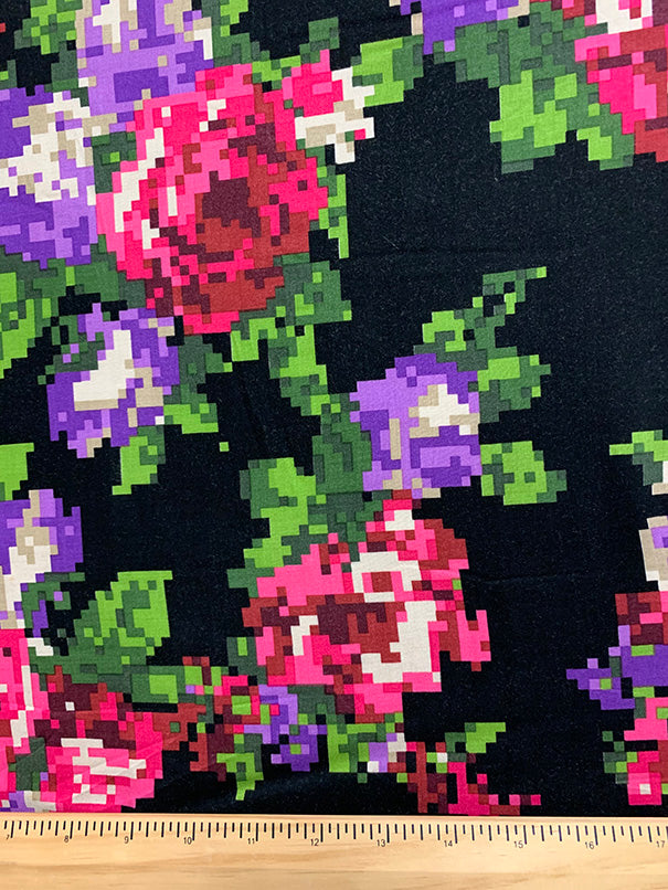 -Purple, Red, Brown, Copper, Tan, Green, Ivory, & Hot Pink Pixelized Floral Print on Black Rayon Challis Fabric