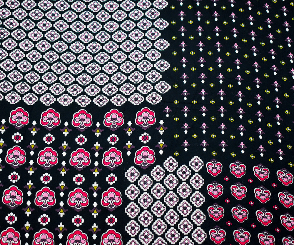 -100% rayon challis woven fabric printed with floral inspired motifs in a patch-like stylized pattern