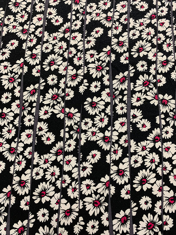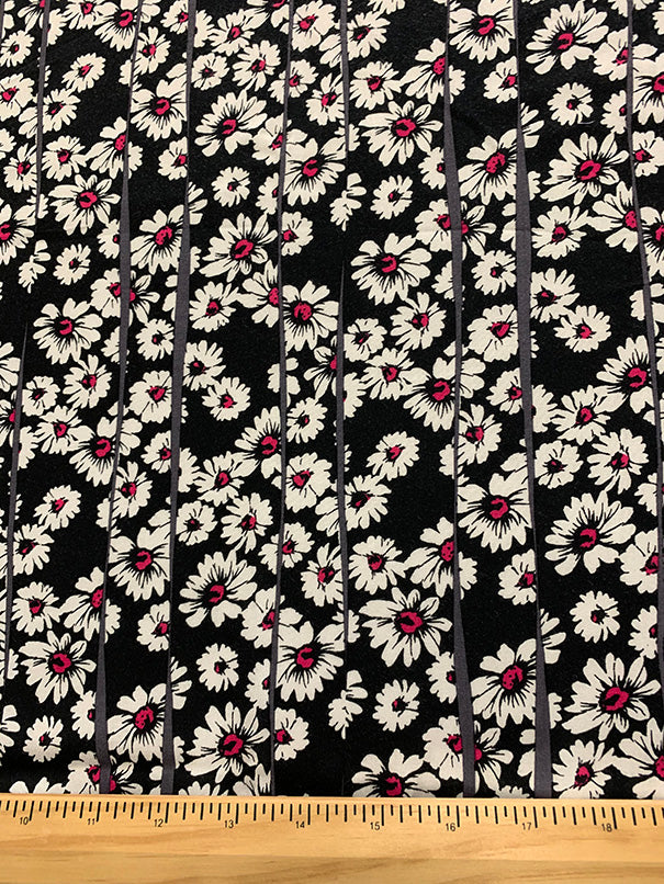 -White, Blue, & Bright Red Floral & Gray Uneven Wavy Stripe Print Rayon Challis Fabric