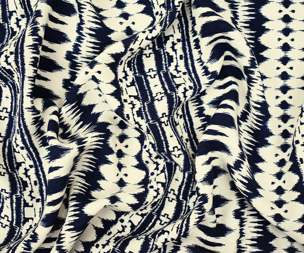 -100% rayon challis woven fabric printed with a stylized ikat pattern in a striped arrangement.