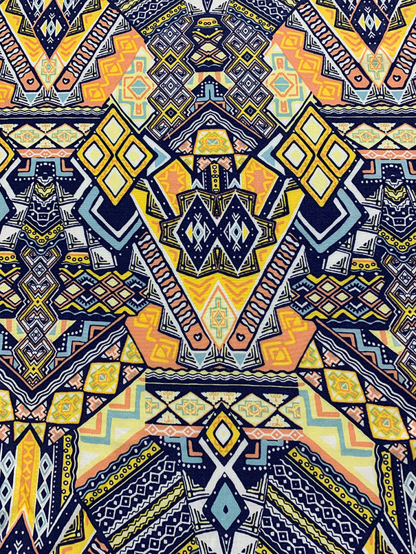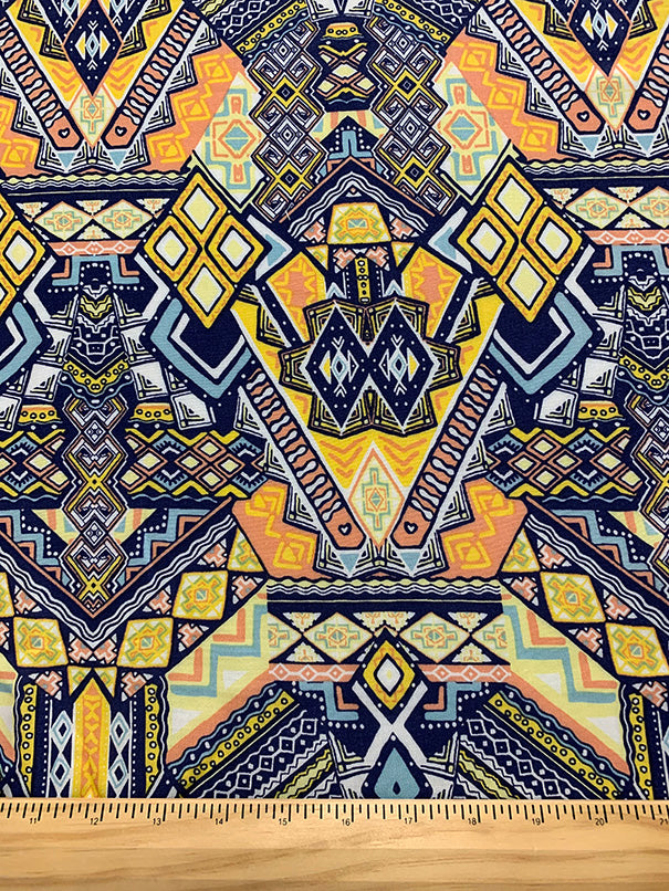-Blue, White, Peach, Yellow, & Navy Blue Multi Aztec Print Rayon Challis Fabric