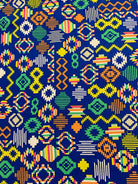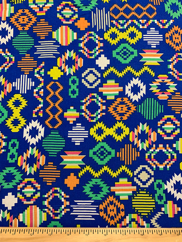 -Orange, White, Yellow, Pink, Beige, & Green Multi Color Aztec Print on Blue Rayon Challis Fabric