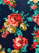 -Red, Coral, Green, Ivory, Beige, & Gold Pixelized Floral Print on Blue Rayon Challis Fabric