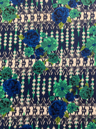 -Blue, Green, White, & Black Rose Novelty Horizontal Stripe Print Rayon Challis Fabric