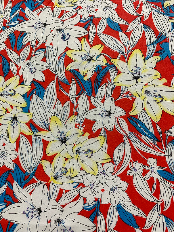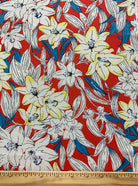 -White, Yellow, Blue, & Black Lily Floral Print on Flamingo Red Rayon Challis Fabric