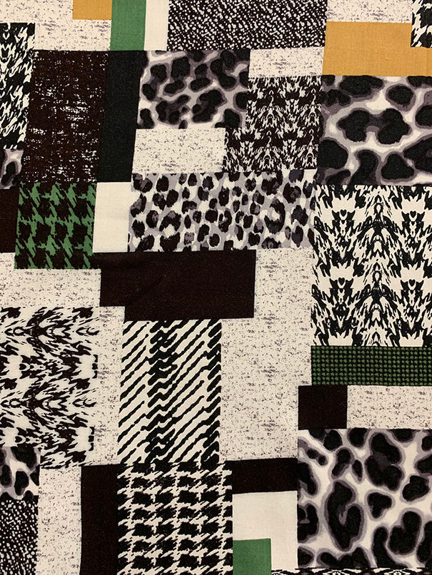 -Green, Gold, Black, White, & Gray Multi Animal & Patchwork Print Rayon Challis Fabric