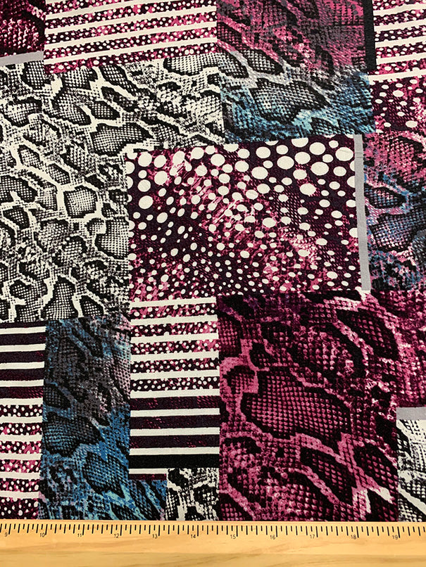 -Magenta, Teal, Black, & White Multi Animal Multi Patchwork Print Challis Fabric