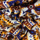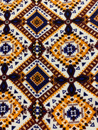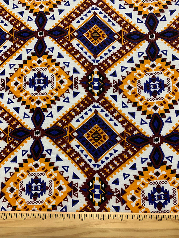 -Orange, Maroon, & Blue Multi Aztec Print on White Rayon Challis Fabric