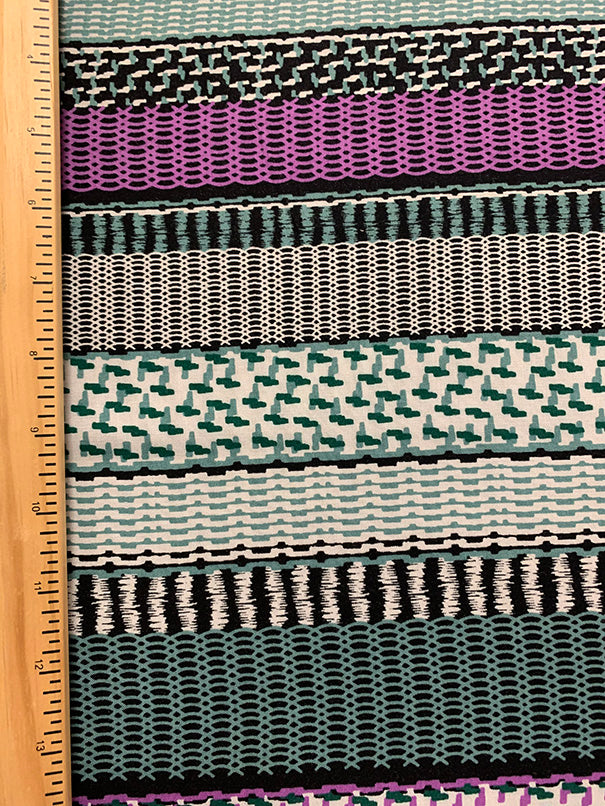 -Purple, Aqua, Black, & White Multi Stripe Print Rayon Challis Fabric