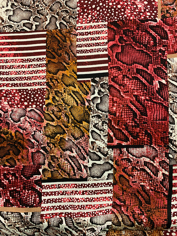 -Red, Black, Brown, & White Multi Animal Patchwork Print Rayon Challis Fabric