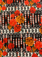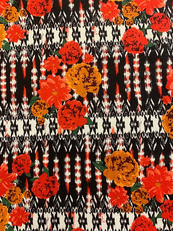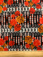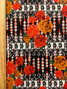 -Red, Orange, Rust, White, Black, & Green Rose Novelty Stripe Print Rayon Challis Fabric