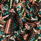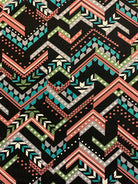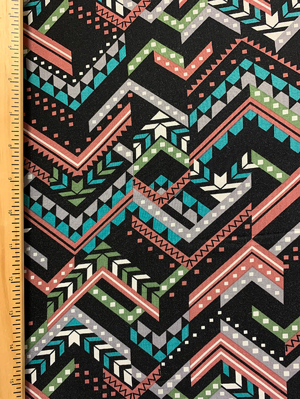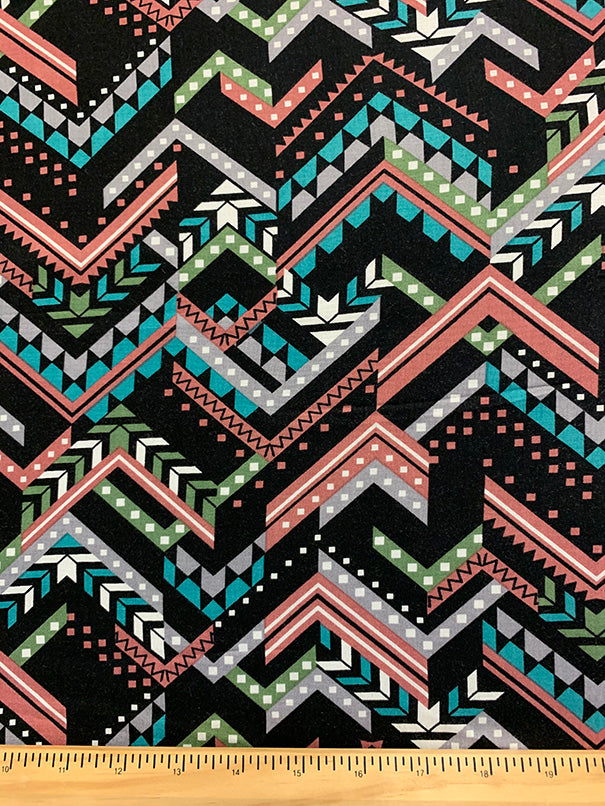 -Teal, Gray, Rose, Green, White, & Black Multi Broken Chevron Print Rayon Challis Fabric