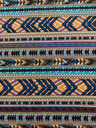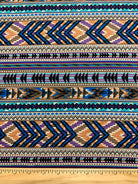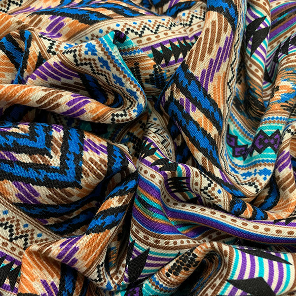 -Purple, Teal, Orange, Bronze, Black, Blue, & White Multi Print Horizontal Stripe Rayon Challis Fabric