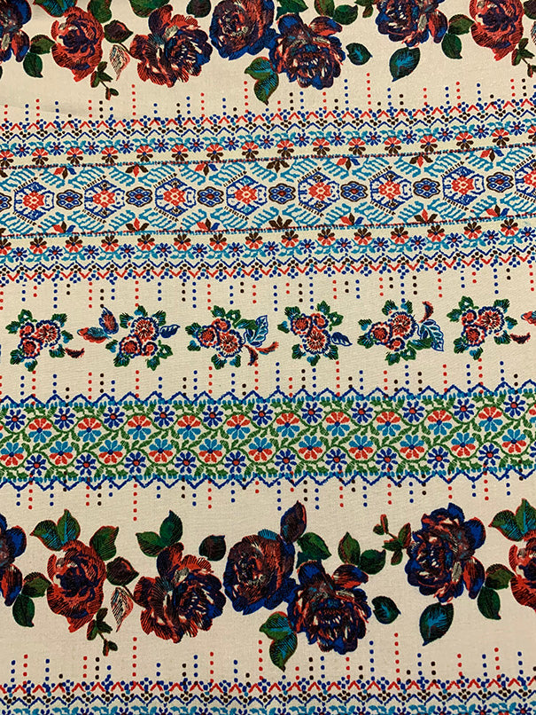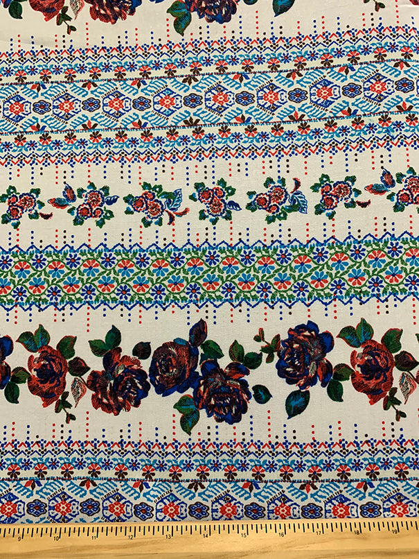 -Red, Blue, Green, Turquoise, & Black Floral & Dot Horizontal Stripe Print on White Rayon Challis Fabric