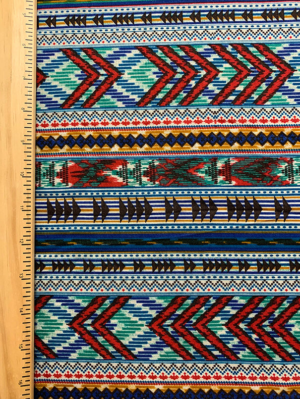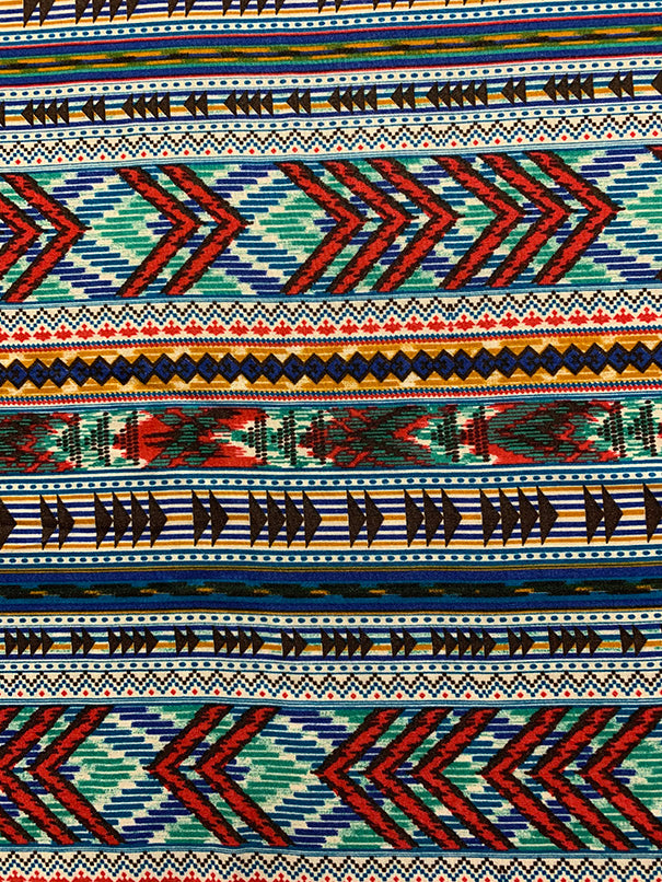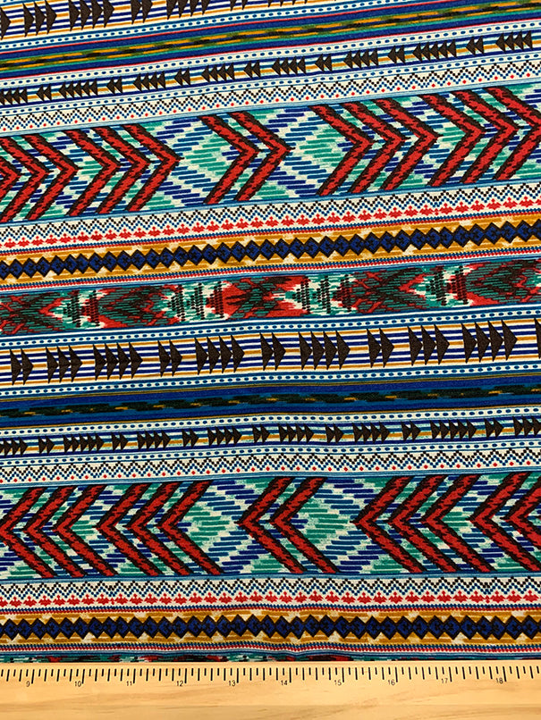 -Green, Blue, Red, Brown, & Gold Multi Horizontal Stripe Print on White Rayon Challis Fabric