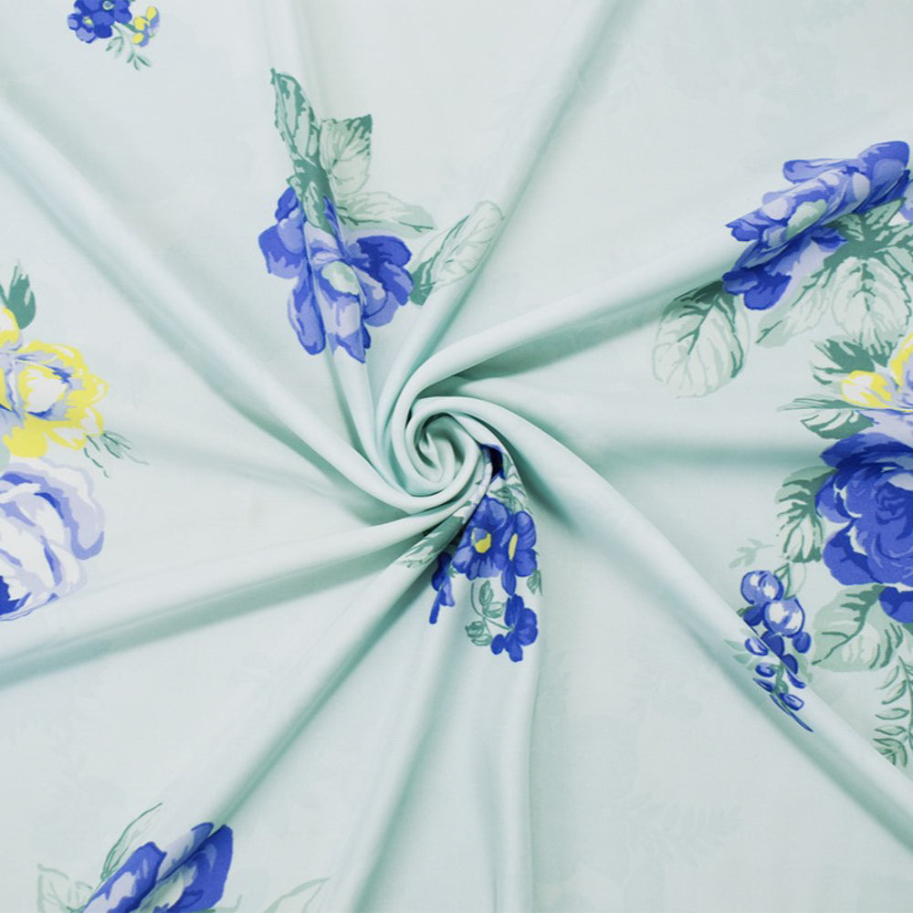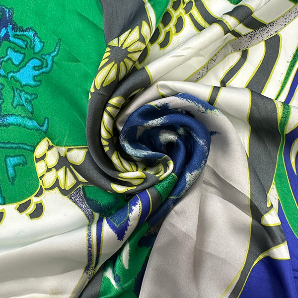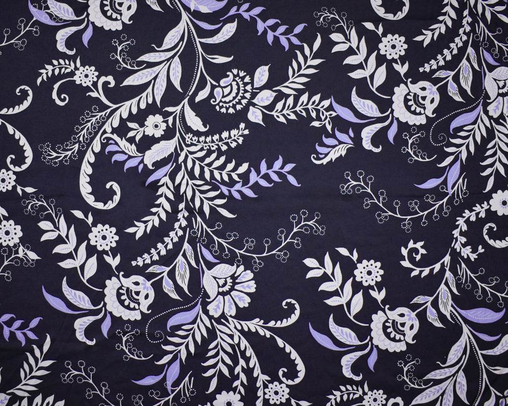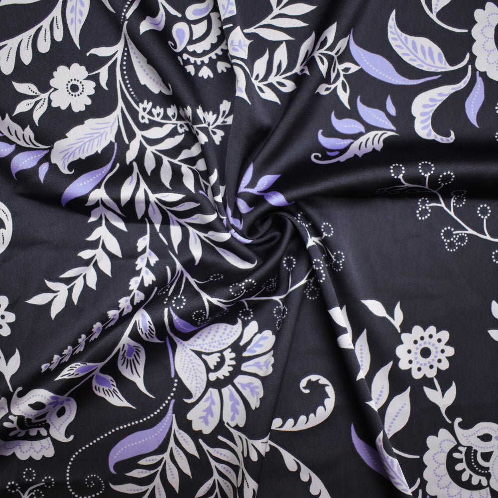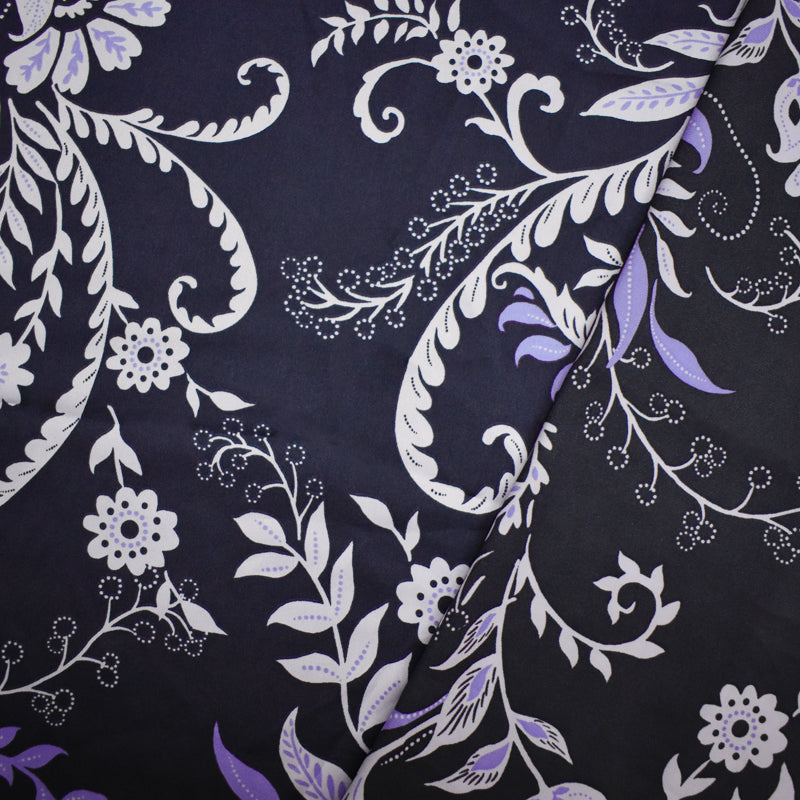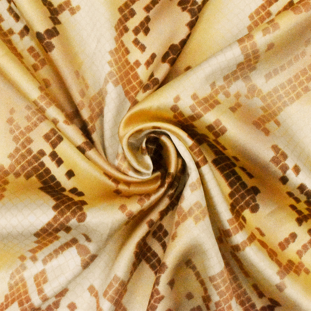 Charmeuse fabric can be solid or printed designs, and is a lightweight fabric woven with a satin weave that gives the front of the fabric a smooth finish — lustrous — with a matte backside. Most commonly used in evening wear as well as blouses, dresses, linings, and lingerie. Available in many gorgeous colors and prints!