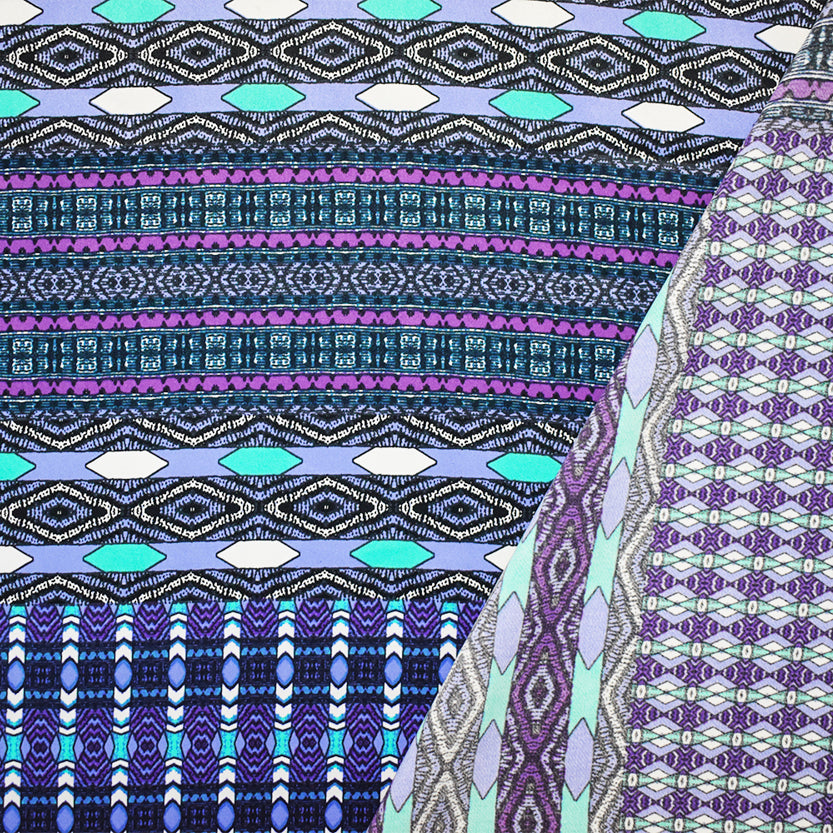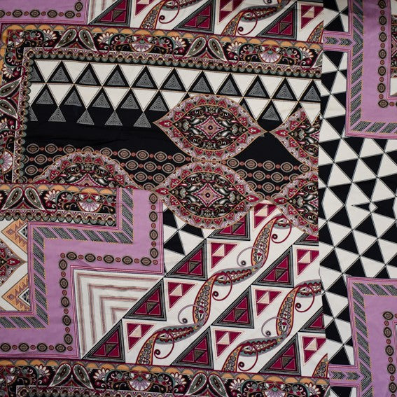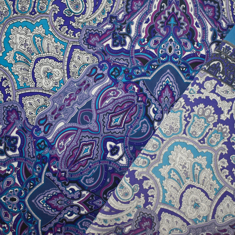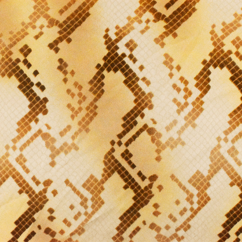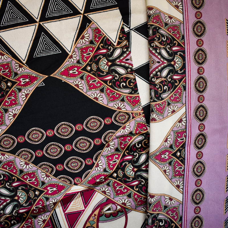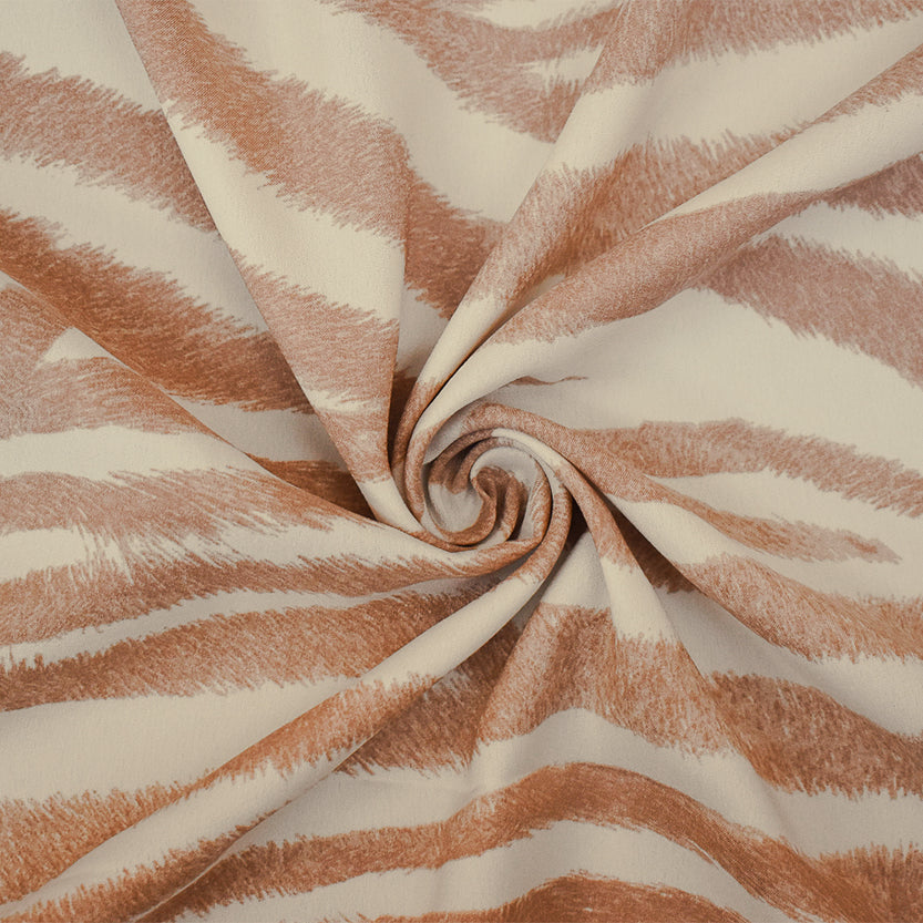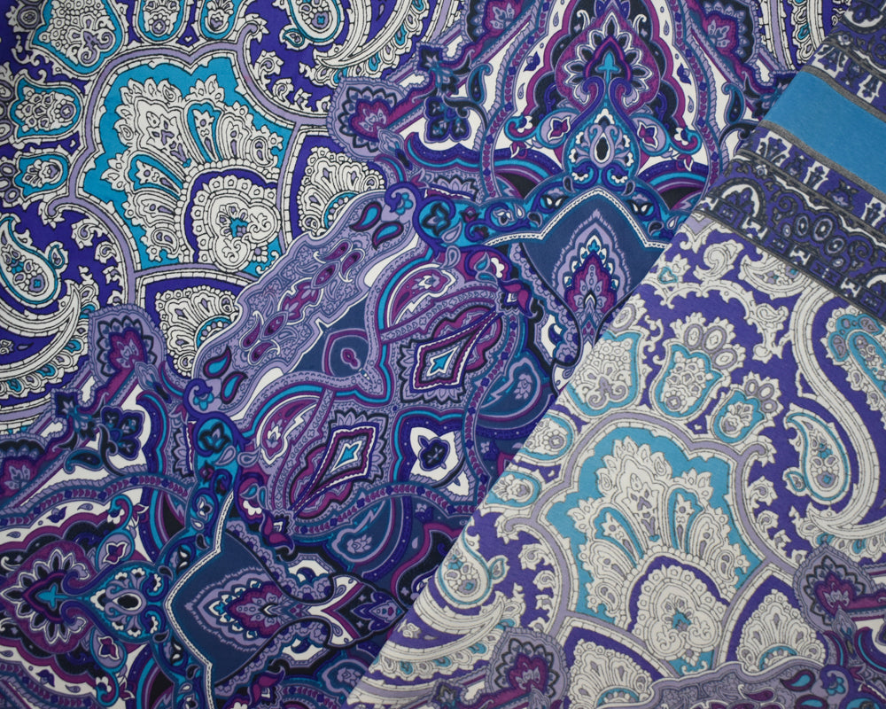 Charmeuse fabric can be solid or printed designs, and is a lightweight fabric woven with a satin weave that gives the front of the fabric a smooth finish — lustrous — with a matte backside. Most commonly used in evening wear as well as blouses, dresses, linings, and lingerie. Available in many gorgeous colors and prints!