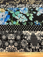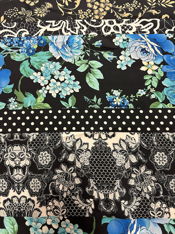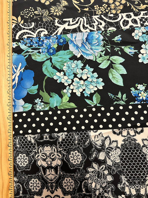 -Blue, Aqua, Gold, Ivory, Green, & White Lace & Floral Horizontal Stripe on Black Charmeuse Satin Fabric