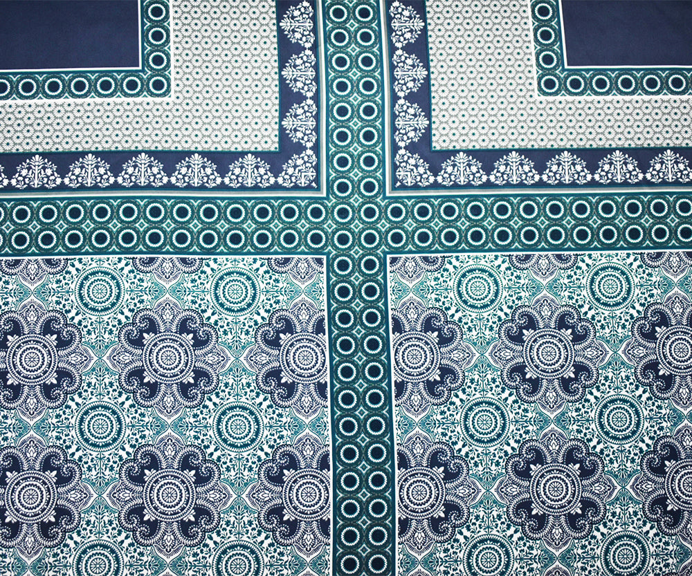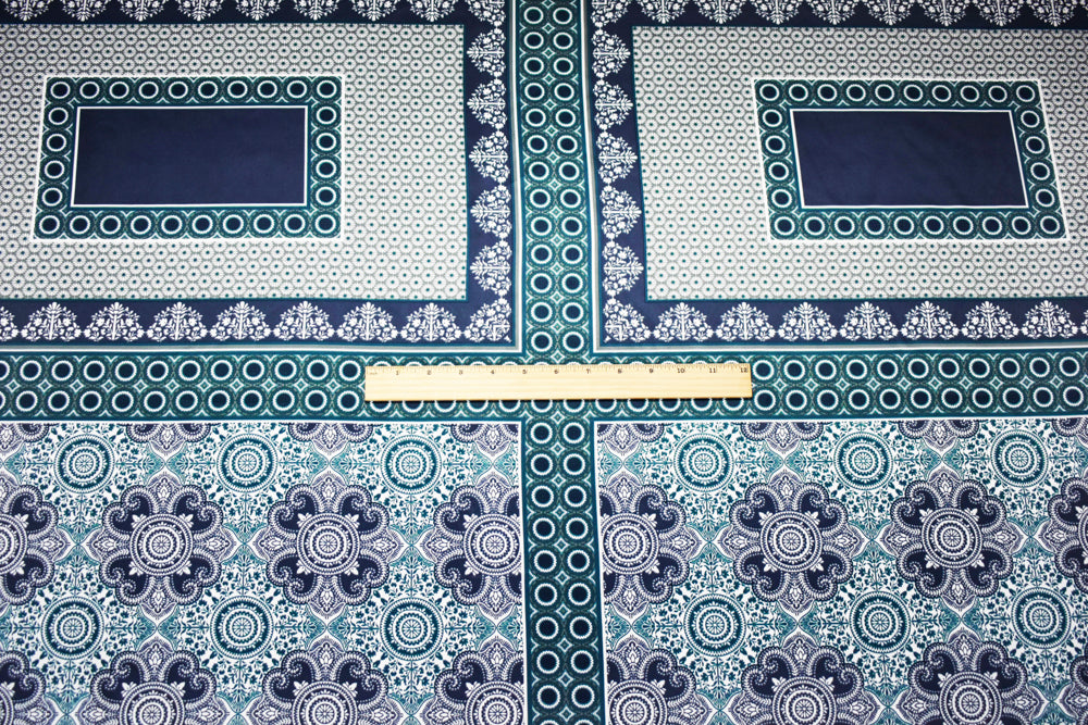 -Deep Teal-Multi Poly Bandana Border PANEL Medallion Printed Charmeuse Woven Fabric