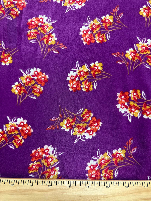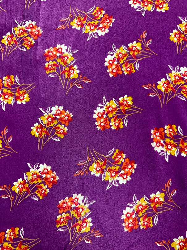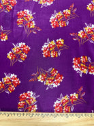 -Red, Gold, White, & Orange Floral Print on Purple Sueded Poly Charmeuse Fabric