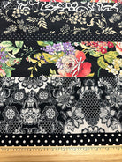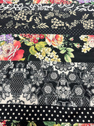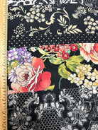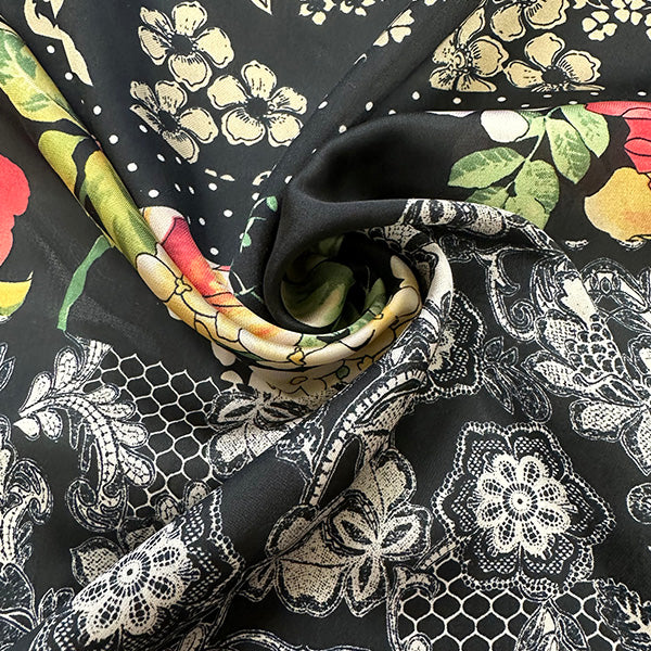 -Red, Pink, Purple, Green, Cream, Ivory, Yellow, White Lace & Floral Horizontal Stripe on Black Charmeuse Satin Fabric